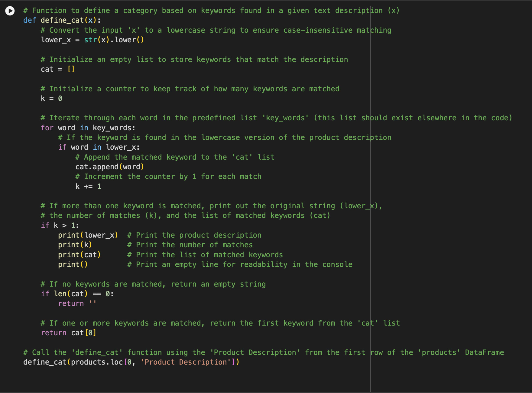 I used Python to automate data sorting for the integration of a Rental Management System. This involved transferring data from QuickBooks, such as warehouse goods, machinery parts, and filters, while applying keyword matching algorithms to categorize datasets. The top picture showcases the code I used in Google Colab to parse the data, and the bottom left image illustrates the result of the code implementation. These solutions streamlined operations, improved efficiency, and enabled smoother data integration and customer engagement.